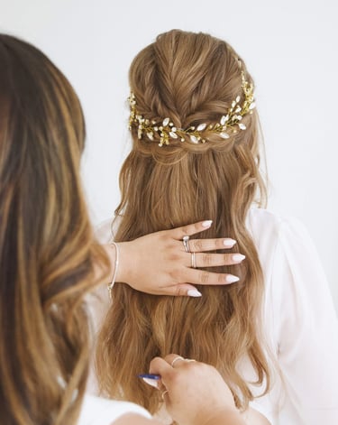 I specialize in romantic, soft, and textured wedding hair that looks effortless (but holds up like a champ). If you're into timeless styles that don’t feel stiff, overdone, or like something you’d see in a prom photo from 2006, you're in the right place. Think lived-in waves, dreamy buns, face-framing pieces that fall just right...and not a crunchy curl in sight